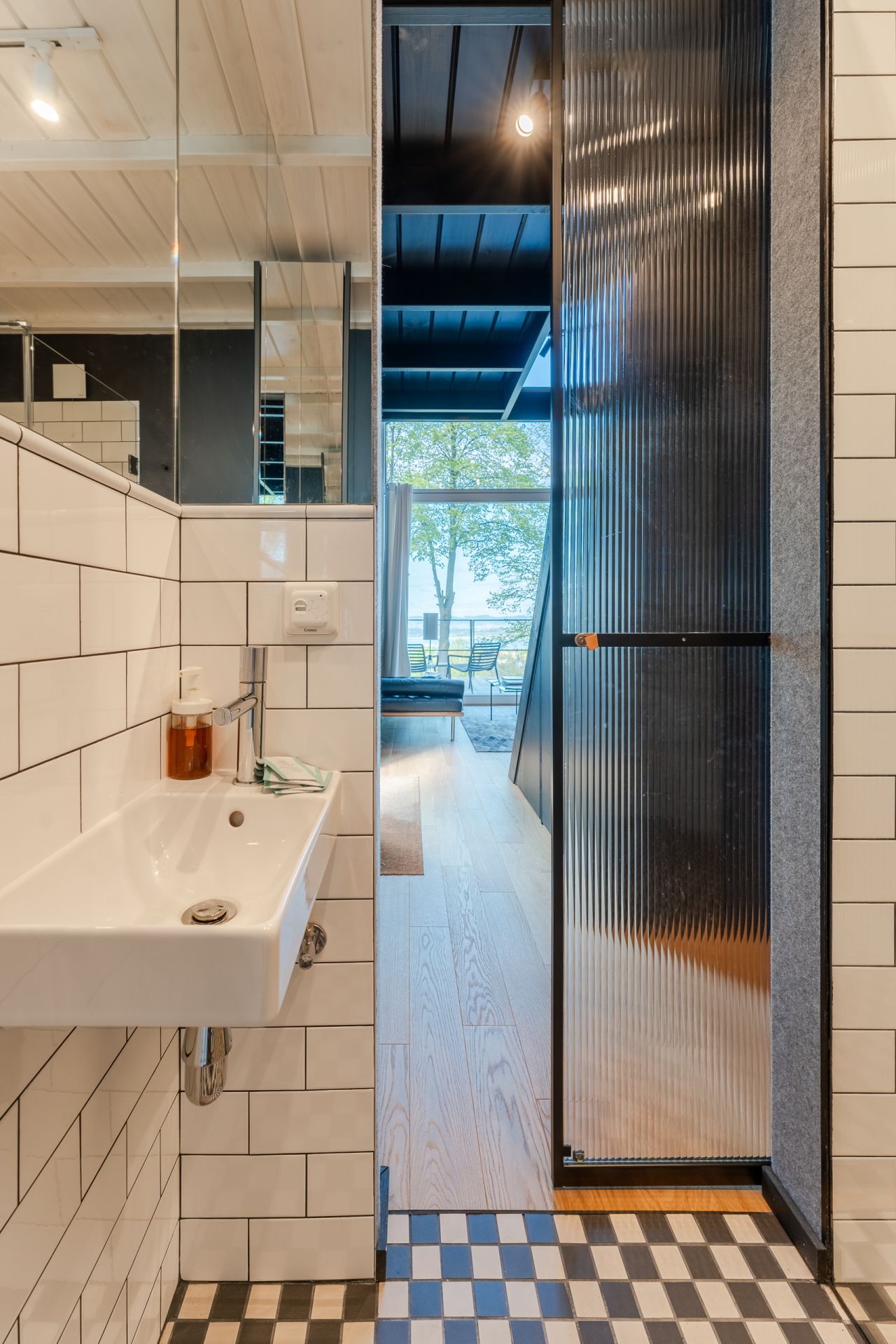 Wnętrze wypełnione jest naturalnym światłem wpadającym przez duże przeszklenia.